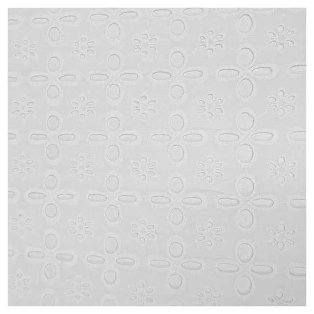 Descripción:Creada sobre una base de algodón, viscosa o Jersey con bordados y pequeños orificios que realzan el diseño. Tiene bordado también ambos costados, dandole a la tela una terminacion muy delicada.