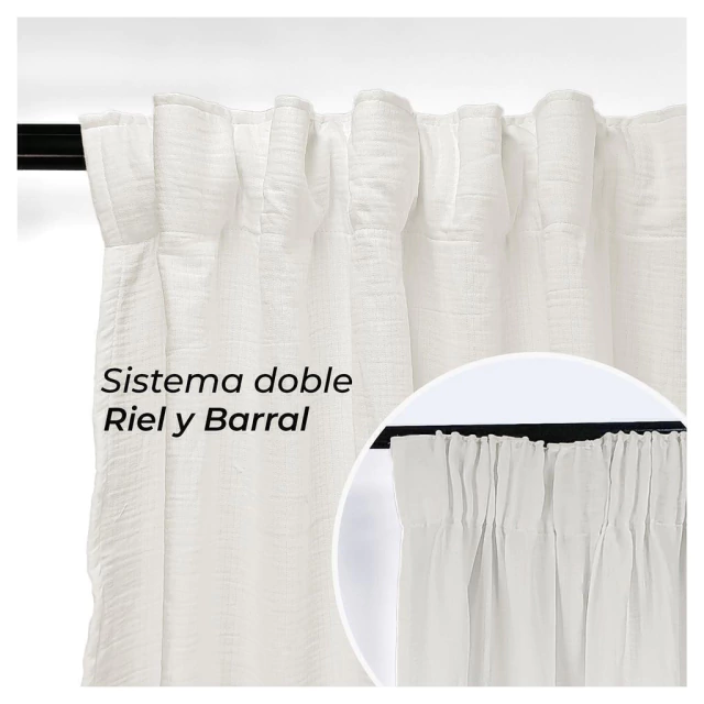 Descripción:Hermosa cortina de gasa Octavio liviana y de apariencia rustica caracterizada por su textura suave y con caida fluida. Es semi transparente, la misma aporta sostificación al hogar. Esta tiene la particularidad de su doble sistema, ya que sirve tanto para riel como para barral.