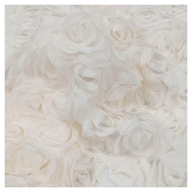 Descripción:Este tul bordado, esta confeccionado con un microtul con patrolenes cocidos en espiral creando la forma de flores que cubren de forma pareja la superficie, formando asi el efecto tridimencional como si fueran flores colocadas en una tela, no es elastizado y al ser de microtul tiene transparencias que se dejan ver entre las flores.